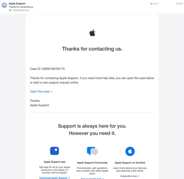 What made the attack impressive was the next move: The scammers actually contacted Apple Support themselves, pretending to be me, and opened a real case claiming I’d lost my phone and needed to update my number. That generated a real case ID, and triggered real Apple emails to my inbox, properly signed, from Apple’s actual servers. These were legitimate; no filter on earth could have caught them.